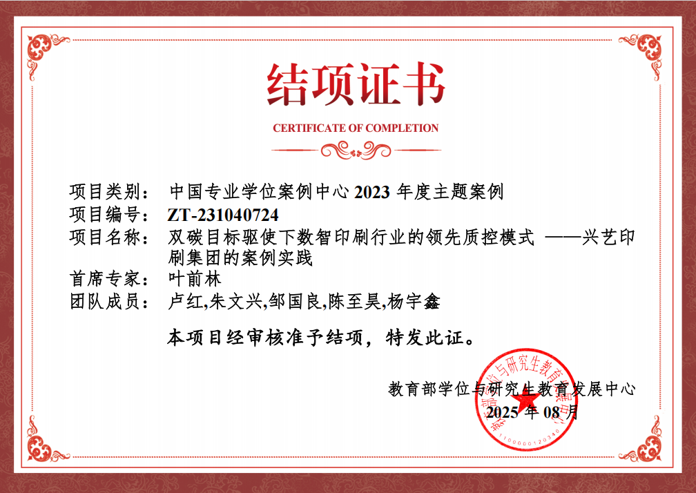 2025年8月27日,教育部学位与研究生教育发展中心发布了《关于2023年度主题案例项目结项的通知》,我院2023年度入选的主题案例项目《双碳目标驱使下数智印刷行业的领先质控模式——兴艺印刷集团的案例实践》(编号:ZT-231040724),经过严格的评审流程已经通过审核完成验收,顺利结项。该项目由叶前林副教授作为首席专家主持,团队成员包括卢红副教授、朱文兴教授、邹国良教授、研究生陈至昊、杨宇鑫。依托项目开发撰写的3篇原创案例成果,将按程序收录入中国专业学位案例中心案例库。