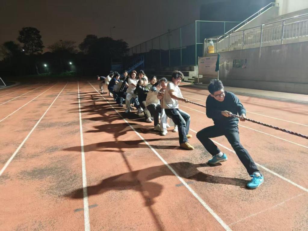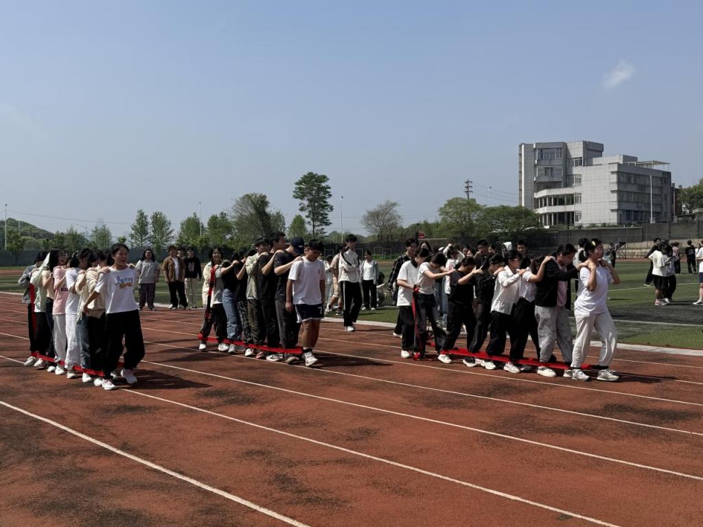 同炉共进赛道上,队员们步调一致向前冲刺,喊着整齐的口号,把团队的信任化作前行的动力;钨金战鼓项目里,大家手牵着绳子,跟着鼓面跳动的节奏调整步伐,每一次成功颠球都引来全场欢呼;金石投趣的场地上,精准的投掷与接力传递考验着大家的反应与配合,笑声与加油声此起彼伏;稀土争锋的拔河赛中,队员们紧握长绳、合力后拉,每一次拉锯都引得全场呐喊助威。同学们以饱满的热情投入到每一项挑战中,在春日的阳光下尽情挥洒汗水,用呐喊与欢笑书写着属于商学院学子的青春风采。