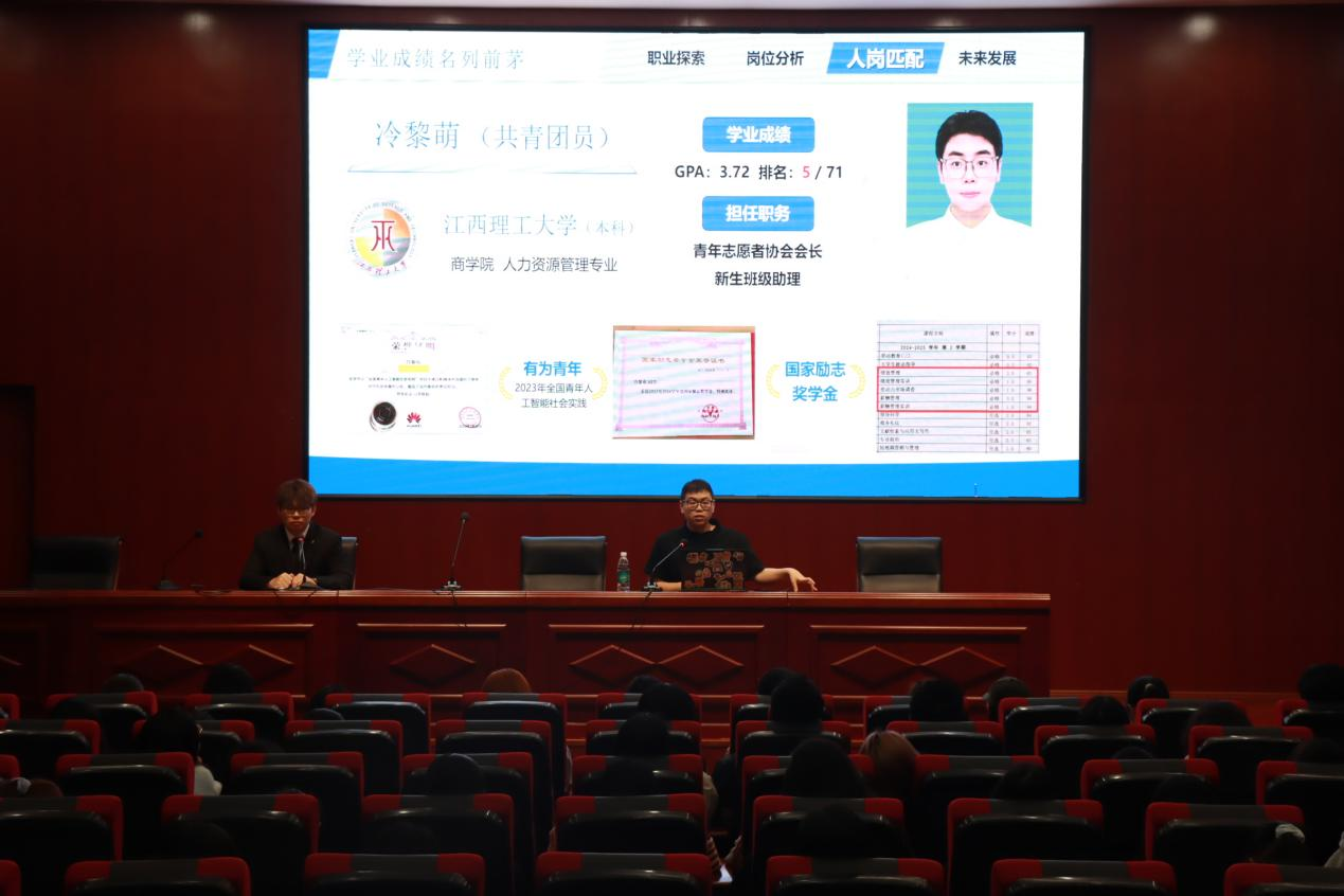 冷黎萌结合自身实习与求职经历,分享了从校园走向职场的成长经验。他详细介绍了在数字化实践中的成果,包括运用Excel搭建人力资源系统、采用Word2vec技术构建薪酬调查模型等;并分享了在比亚迪、先导科技等企业的实习经历,目前已收到格力、美团、货拉拉等多家知名企业录用通知。他鼓励同学们主动走出校园,积极参与社会实践,在实践中提升综合能力、明确职业方向。
