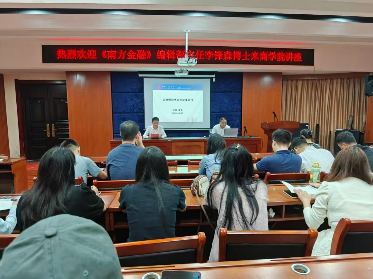 2025年10月17日,江西理工大学商学院在学术报告厅举“金融理论研究与论文写作”主题学术讲座,特邀《南方金融》编辑部主任、中国人民银行广东省分行高级经济师李锋森博士担任主讲。李博士基于多年研究与审稿经验,就研究选题、研究创新及论文写作要点进行系统讲解。