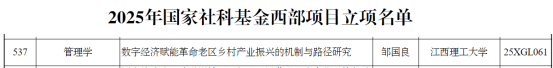 2025年9月29日,全国哲学社会科学工作办公室公示了2025年国家社会科学基金年度项目立项名单,我院邹国良教授申报主持的课题《数字经济赋能革命老区乡村产业振兴的机制与路径研究》(25XGL061)获得西部项目立项。