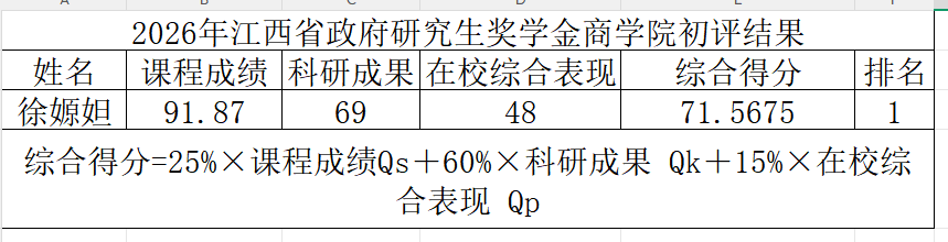 根据学校《江西理工大学关于开展 2026 年江西省政府研究生奖学金评审工作的通知》理工研字[2026]9号文件要求,经学生个人申请,业绩审核及核对,参照《商学院研究生奖学金及年度评价管理办法(修订)》商院发〔2024〕7号文件,依据年度评价办法进行量化计算,确定商学院2026年江西省政府研究生奖学金拟推荐名单,现予以公示。