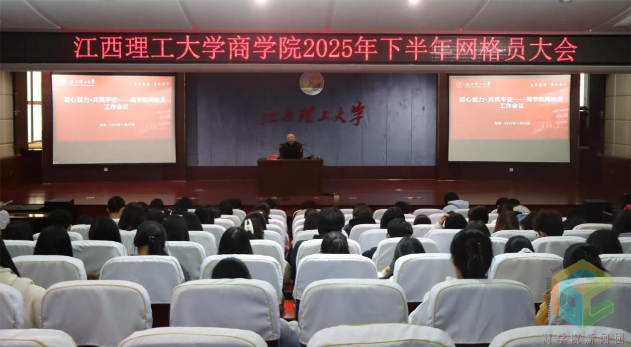 为进一步压实网格化管理责任,提升学生治理精细化水平,筑牢校园安全稳定防线,11月25日下午,商学院在图书馆一楼报告厅召开2025年下半年网格员工作会议。学院党委副书记徐凯主讲,全体学生网格员参会。