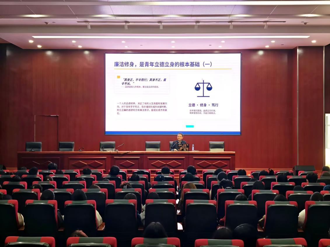 为深入推进校园廉洁文化建设,筑牢青年学生思想道德防线,引导学生骨干与党员先锋坚守廉洁底线、践行使命担当,4月1日下午,商学院在综合实验楼A308报告厅开展“守廉洁初心 担青春使命——做清正廉洁的新时代学生骨干与党员先锋”廉洁教育专题党课。本次党课由学院党委副书记(主持工作)晁云主讲,党建组织员李锐主持,全院学生党员、入党积极分子及各级学生干部参加学习。