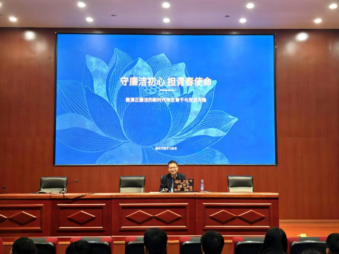 围绕严守廉洁底线,他提出六项行为准则,要求学生党员和骨干把廉洁自律落实到学习、工作、生活各方面,践行服务同学的初心。他勉励大家常怀律己之心、勇担服务之责,以廉洁修身筑牢青春底色,以实干担当争做德才兼备的新时代优秀青年。